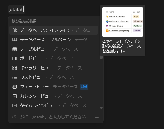 まずページ上で「/database」と入力し、「データベース:インライン」を選択。
