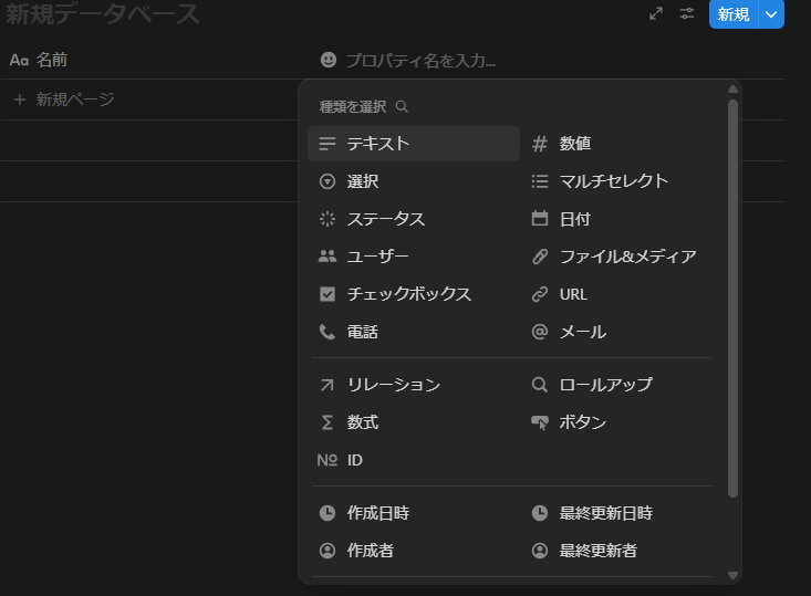 プロパティを追加から、テキスト・日付・セレクトなど適切なプロパティを設定します。