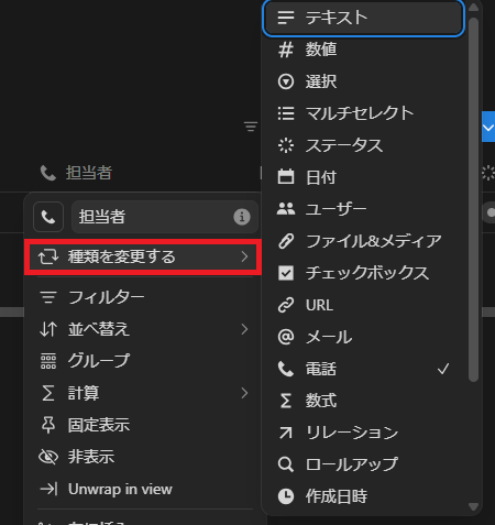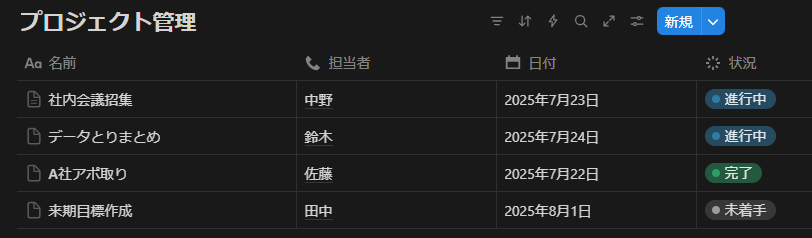 タスク管理なら「担当者」「期限」「ステータス」などが定番です。入力しようとしているデータの種類に応じて選択しましょう。