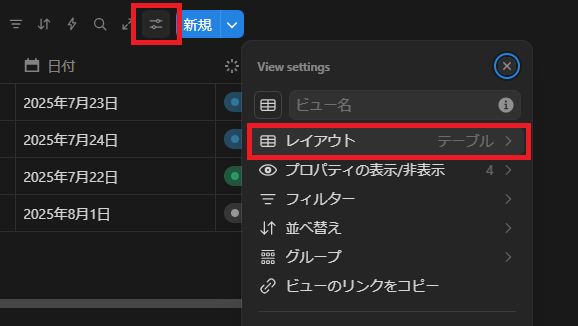 「新規」ボタンの左のボタンからレイアウトが変更できます。