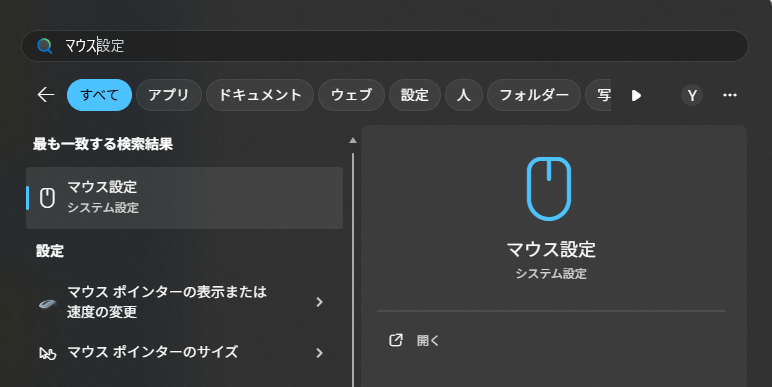 まず、スタート > 設定 > Bluetooth とデバイス > マウス を開きます。なお、スタート画面で「マウス」と検索してもOKです。