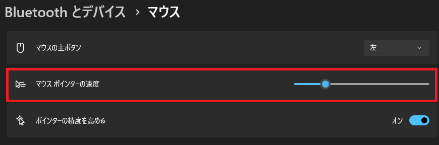 「マウスポインターの速度」のスライダーを左にドラッグするとポインター移動がゆっくりになります。