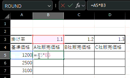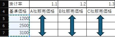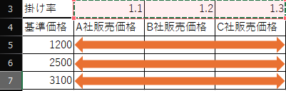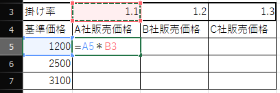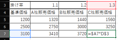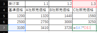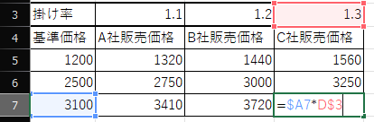 ②横にコピーするときは「掛け率」だけが列方向に変わってほしい(行3は固定)