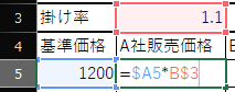 - F4キーを3回押す:A$1 → $A1(複合参照:列のみ固定)