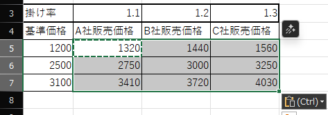あとは、B5の式をコピペすれば、一発で価格表が完成します
