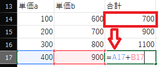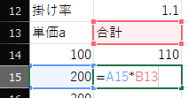 この状態でコピーしてみると、縦にも横にも動くためずれてしまいます。結果として、狙ったセル同士を掛けられません