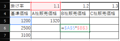 この形なら、下へコピーしても行番号だけが変わる/右へコピーしても列だけが変わります。そのため「その行の基準価格 × その列の掛け率」を掛けられます。