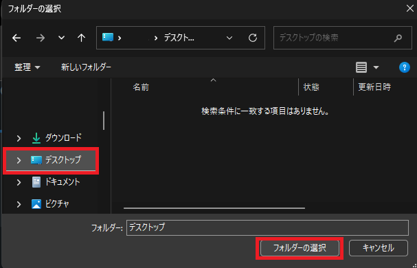 すると、「フォルダーの選択」というウィンドウが立ち上がります。ここで、新しく保存先にしたいフォルダを選び、「フォルダーの選択」ボタンをクリックすれば設定は完了です。