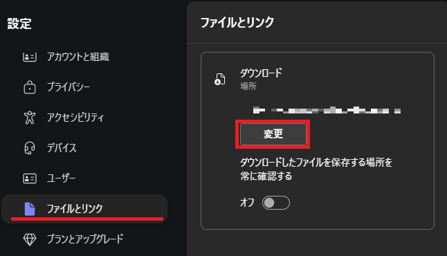 先ほど確認した「ファイルとリンク」の設定画面を開きます。現在の保存先パスが表示されている右隣もしくは下にある「変更」ボタンをクリックしてください。