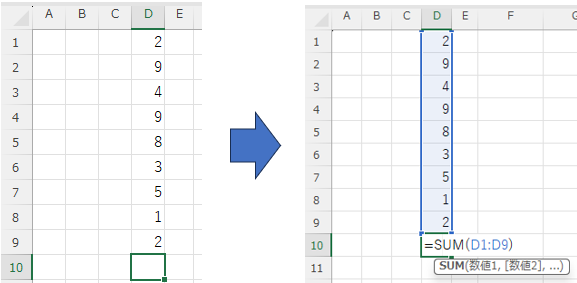 ' 選択したセルにSUM関数(=SUM(D1:D9))を入力する