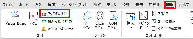 開発タブをクリックして、左側のコードにある「マクロの記録」をクリックします。
