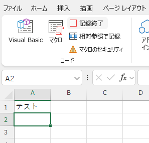 今回は、A1に「テスト」と記入する操作を記録しました。