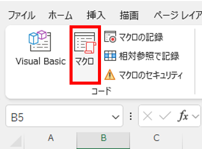 記録されたコードの確認方法は、「マクロ」ボタンをクリックします。