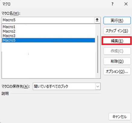 今回作ったマクロの中身を見るため、一番番号が大きい「Macro」を選択し「編集」をクリック