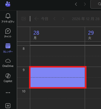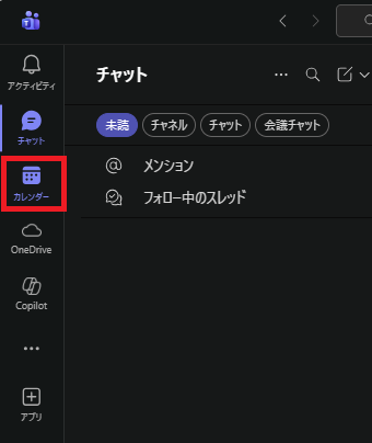 Teamsアプリ左側のメニューバーから「カレンダー」を選択