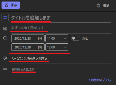 設定画面が開いたら、タイトル・参加者・日時・場所・説明を埋めていきます。