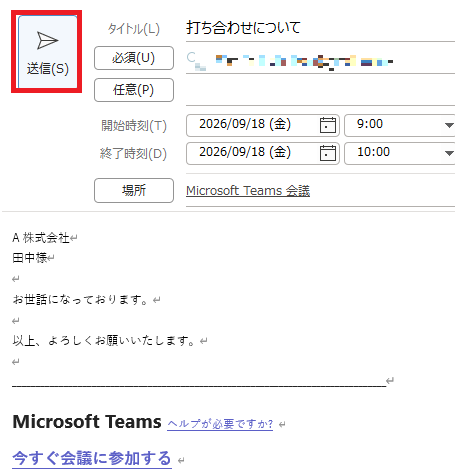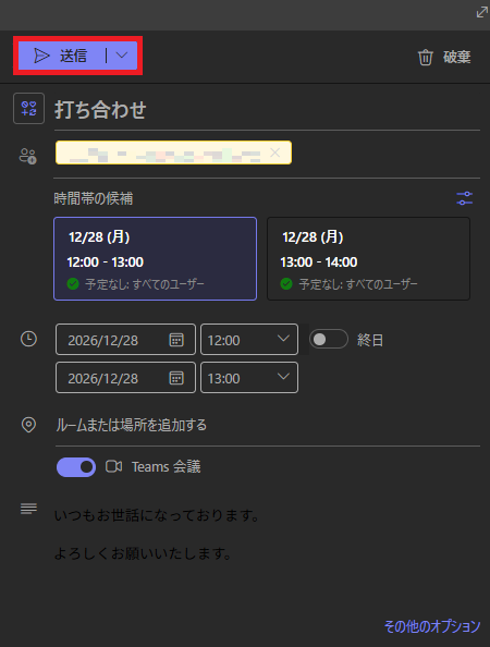 これで送信完了です。Outlookで作成した予定は、自動的にTeamsのカレンダーにも同期されます。