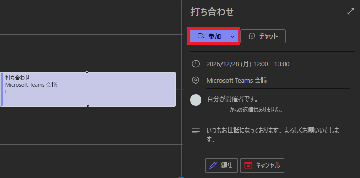 参加するときは、スケジュール欄を選択し「参加」から入ります。