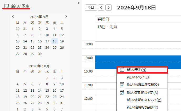 会議を開催したい日時を選択して右クリック。「新しい予定」を選択します。